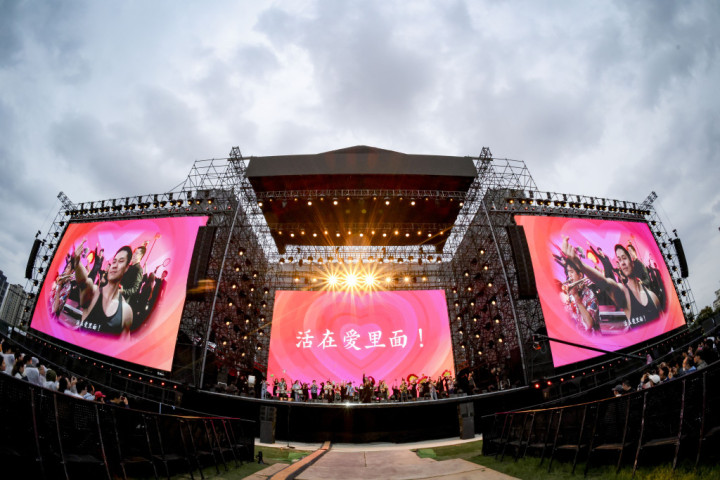 在青浦上达中央公园举行的水岸音乐节上,“艺术天空”特别呈现金承志&上海彩虹室内合唱团音乐会